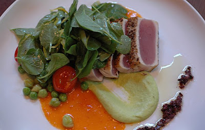 But the best entrée I tried was the Coriander seared yellowfin tuna, fresh garbanzo humus, tomato vinaigrette, olive tapenade. Sushi-grade tuna is a broadly used term in restaurants and rarely lives up to its promise. This one was spectacular. Fresh and tender. As a whole, the dish was delicate yet complex in flavors. Each ingredient was interesting and sometimes surprising by itself but even better when combined together.